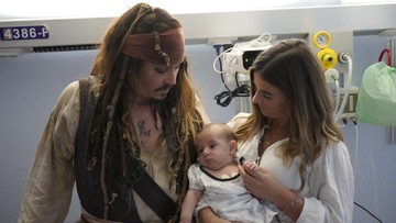 Johnny Depp, berpakaian seperti Jack Sparrow dari Pirates of the Caribbean, mengejutkan anak-anak di rumah sakit Spanyol di San Sebastian.